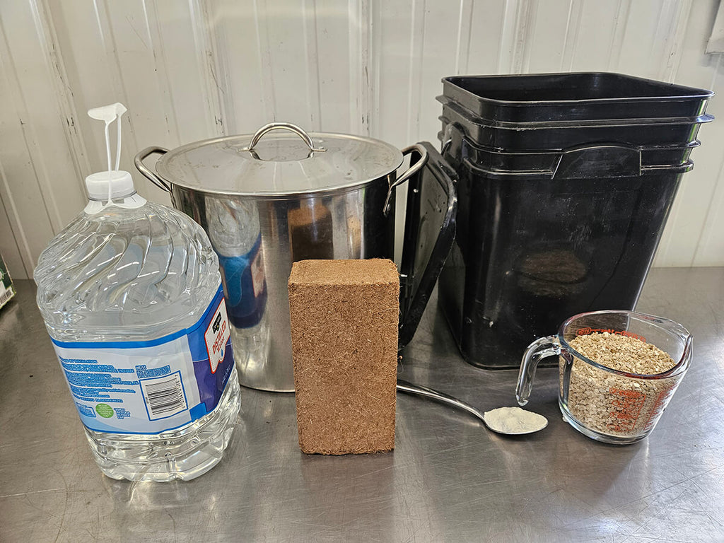 You can find all supplies—coir bricks, gypsum, vermiculite, and buckets—at retailers like Walmart, Home Depot, or online mushroom cultivation stores.